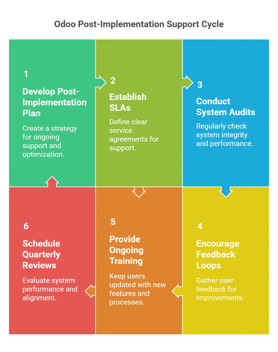 The journey toward a successful Odoo ERP implementation does not end at go-live. Continuous support, performance monitoring, and process optimization are essential for long-term success. Neglecting these areas can lead to decreased user adoption, security risks, and system inefficiencies.
