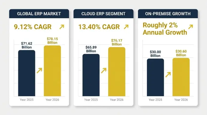 ERP is one of the stronger-performing segments in enterprise software right now. Mordor Intelligence puts the global market at $71.62 billion in 2025, reaching $78.15 billion in 2026 at a 9.12% CAGR through 2031. Cloud ERP is outpacing that, with Fortune Business Insights tracking the cloud segment at $65.89 billion in 2025, growing to $76.17 billion in 2026 at a 13.40% CAGR through 2034. On-premise sits at roughly 2% annual growth. The direction is settled.