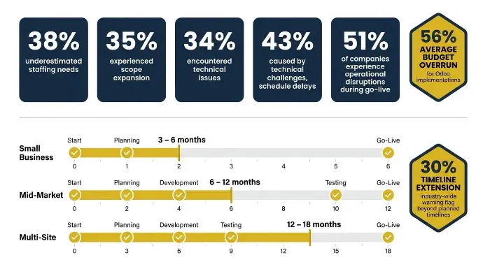 Across the broader industry, ERP implementations can extend 30% beyond planned timelines, and 51% of companies experience operational disruptions during go-live.