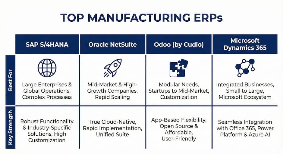 SAP S/4HANA is the industry-standard ERP for large-scale manufacturers requiring robust, global supply chain management.