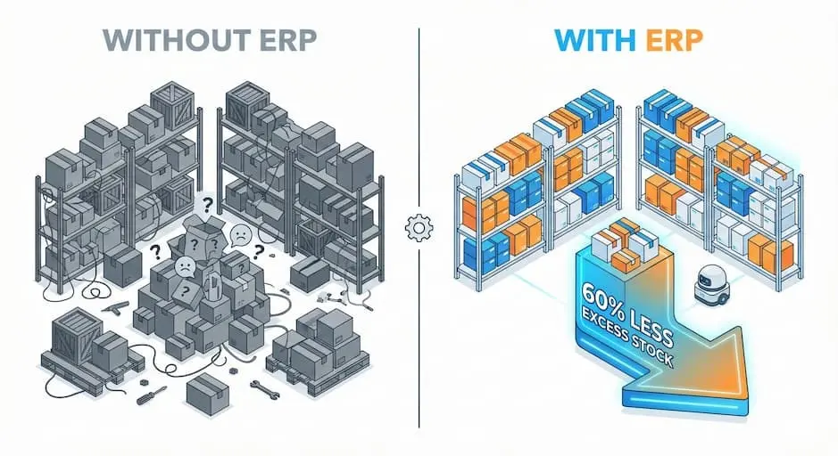 - Better inventory control and order management. ERP software can reduce excess stock by up to 60 percent and improve order accuracy.