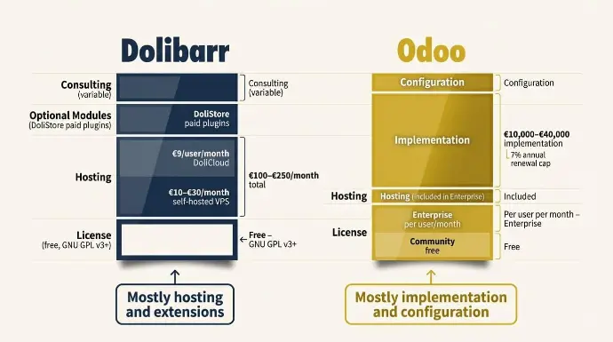 At Cudio, we explain the difference to clients like this: Dolibarr's cost is mostly what you pay to host and extend it. Odoo's cost is mostly what you pay to implement and configure it properly. Both can be reasonable, but only if you go in knowing which costs actually apply to your situation.