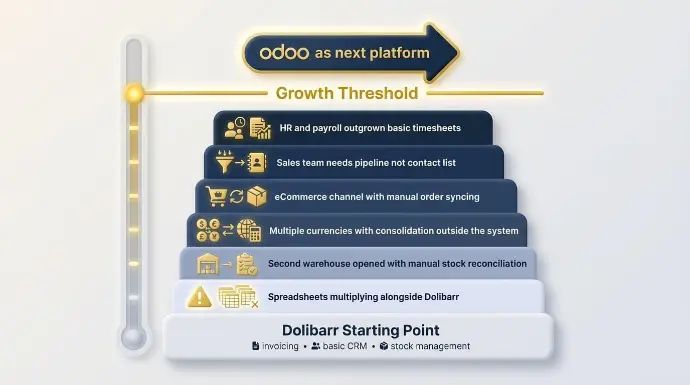 The operational complexity threshold is not about company size. It is about process depth. A 15-person product business can outgrow Dolibarr faster than a 40-person service firm, depending on what they are doing.