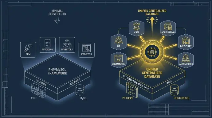 Dolibarr utilizes a simplified, low-resource PHP/MySQL framework designed to execute core functions (CRM, invoicing) out-of-the-box with minimal server load. In contrast, Odoo utilizes a Python/PostgreSQL stack built around a modular architecture, where applications function independently but share a unified, centralized database.