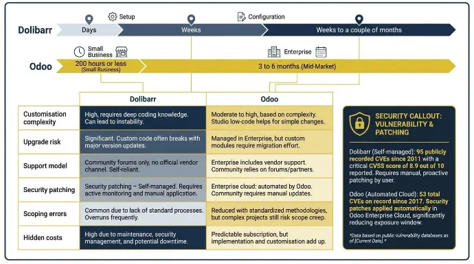 If speed to value matters most and your operations are simple, Dolibarr is the faster path. If you need a more capable platform and can invest in setting it up properly, Odoo's timeline reflects that depth.