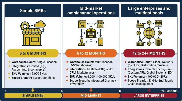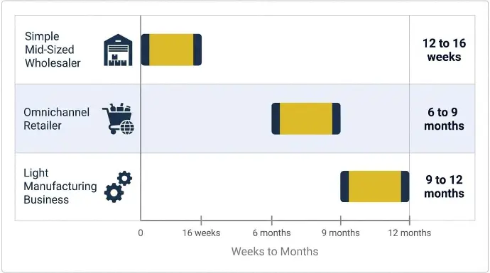 - Mid-market omnichannel operations (multi-warehouse, Shopify plus Amazon plus B2B portal, 10k+ SKUs, complex pricing): 6 to 12 months. Integration depth and data volume drive the schedule in these ERP projects more than anything else.