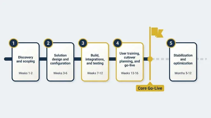 Our typical implementation timeline: 12 to 16 weeks for core go-live.