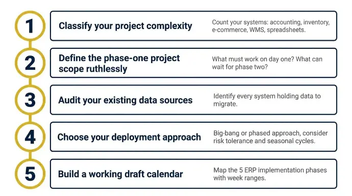 - Classify your project complexity. Count your systems: accounting, inventory, e-commerce, WMS, spreadsheets. Count sales channels. Estimate active SKUs. List locations. This classification determines your realistic ERP implementation timeline, not your employee count.