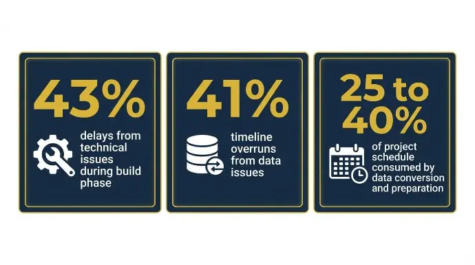 Data quality is the second major risk: 41% of project timeline overruns trace directly to data issues, per Panorama Consulting. If your existing data is spread across QuickBooks, spreadsheets, Shopify, and a standalone WMS, data conversion and preparation work alone can consume 25 to 40% of the project schedule — which is why we begin data cleansing and validation in Phase 1, not Phase 3.