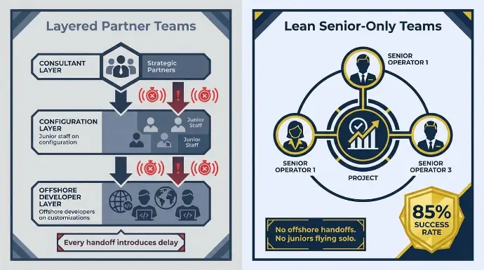 - Layered implementation partner teams: Junior staff on configuration, offshore developers on customizations, rotating consultants learning your business model mid-project. Every handoff introduces delay. Every new face requires ramp-up time on your schedule.