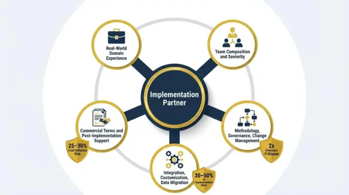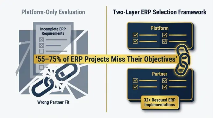 The gap between platform evaluation and partner evaluation is why 55–75% of ERP projects miss their objectives, according to Panorama Consulting's 2024 ERP Report. Only half the decision was made.