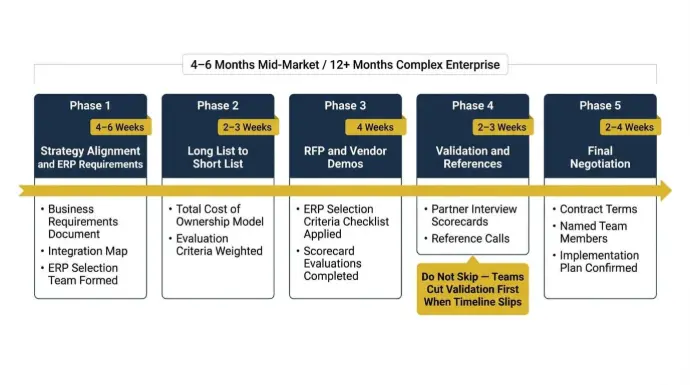 Mid-market erp selection process takes 4-6 months. Complex enterprise resource planning (ERP) RFPs run 12 months or more. Rushing is a known risk factor. Here is a realistic phase structure: