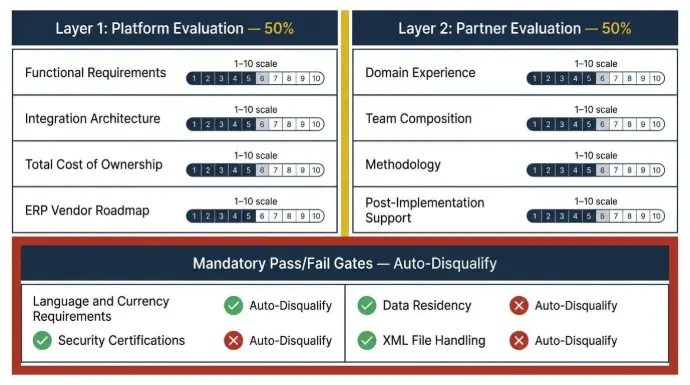 Use a 1-10 scale with mandatory pass/fail gates for non-negotiables. Language and currency requirements, data residency, security certifications, and XML file handling disqualify ERP software options regardless of their scores elsewhere.