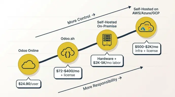 Self-Hosted on AWS/Azure/GCP | You manage the cloud, Odoo manages the app | Tech-savvy businesses needing flexibility | $500-$2K/mo infra + license |