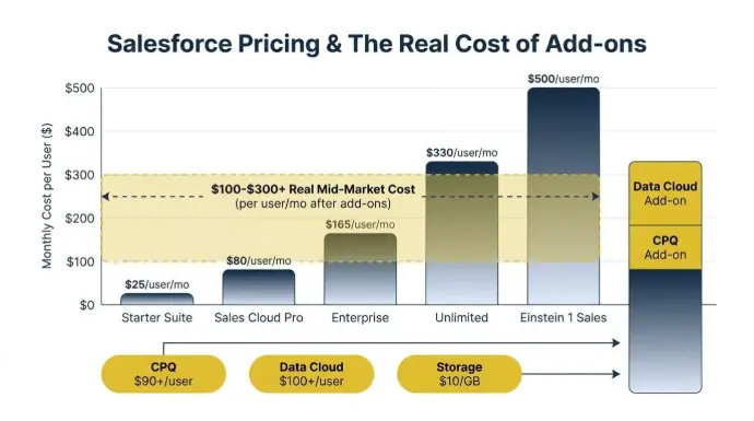 Add-ons raise the real cost significantly. CPQ (for quoting) costs $90+ per user. Data Cloud costs $100+ per user. Storage overages run $10 per GB. Many mid-market businesses end up at $100-$300+ per user per month after add-ons.