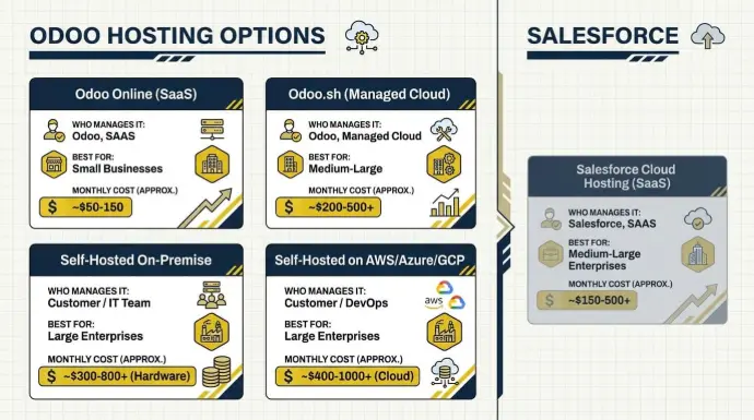 When comparing Odoo vs Salesforce on hosting, the answer for most mid-market businesses is clear.