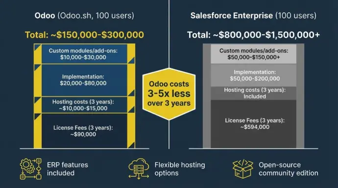 The gap is large. A 100-user business comparing Odoo and Salesforce typically finds Odoo costs 3-5x less over 3 years. Third-party analysis from Cirrus Insight shows Salesforce's 3-year total cost for 100-500 user deployments in the $2.97 million to $4.5 million range.