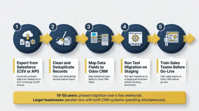 If you are comparing Odoo Salesforce options and leaning toward switching, the migration question is real. Moving from Salesforce to Odoo hosting involves exporting your customer data (contacts, accounts, opportunities, activities) and remapping it to Odoo's data model.
