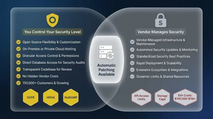 Salesforce cloud hosting handles OS patches, database updates, failover, and scaling automatically. According to Salesforce's own market leadership data, they serve 150,000+ customers with consistent security across every org. That is a genuine advantage if your team does not want to manage infrastructure.