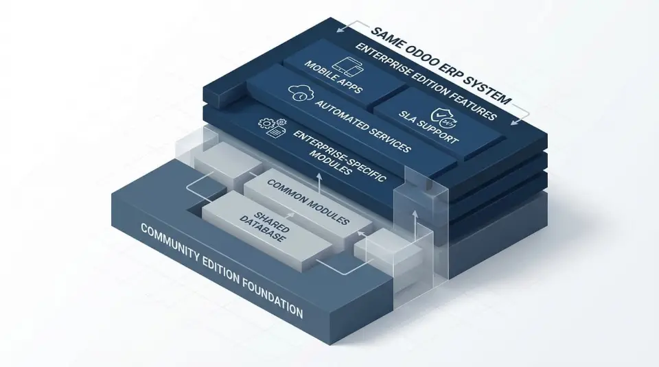 Many business decision-makers misunderstand the architectural relationship between Odoo Community and Enterprise, often viewing them as distinct products rather than a tiered software stack. These are not two different ERP products.