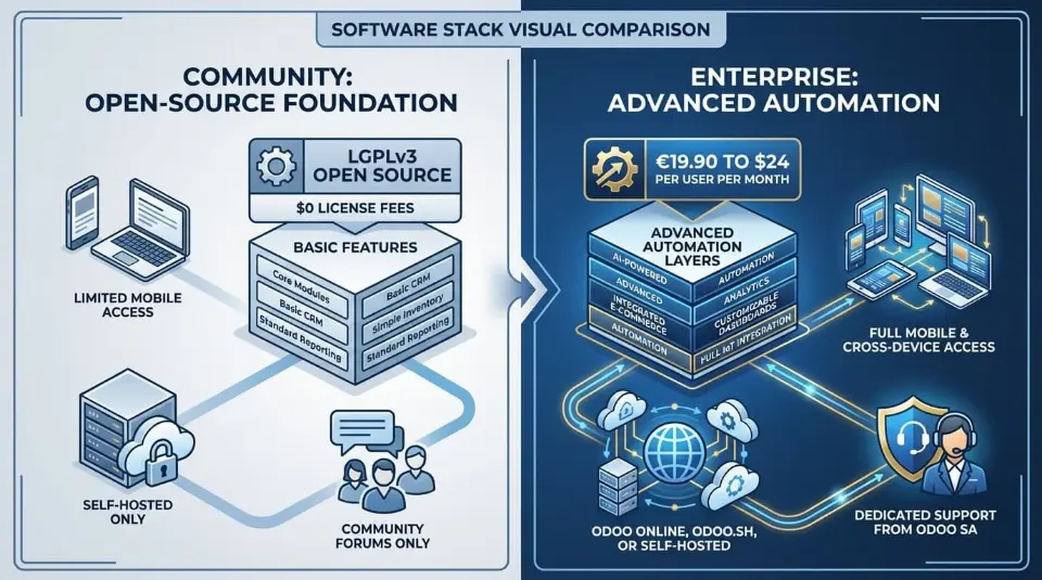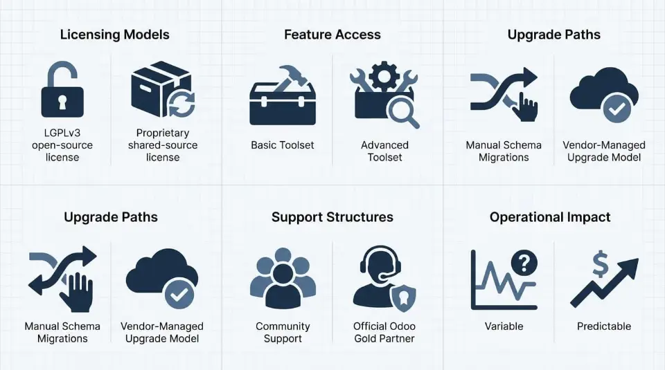 Both editions rely on the same database structure and workflow engine across Odoo versions. Orders, products, accounting entries, and inventory records all follow the same data model. What changes is how the system is licensed, which features are available, who provides support, and how upgrades are executed.