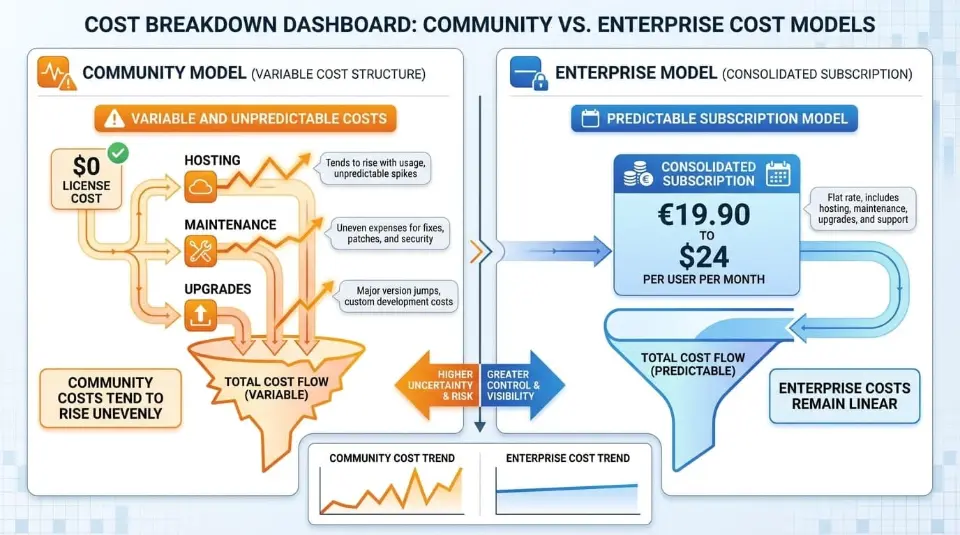 - Community’s free license is often offset by infrastructure, development, and upgrade costs, while Enterprise bundles them into a predictable subscription fee.