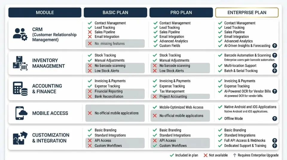 This makes Enterprise better suited for distribution, manufacturing, and service-driven organizations operating across multiple departments.