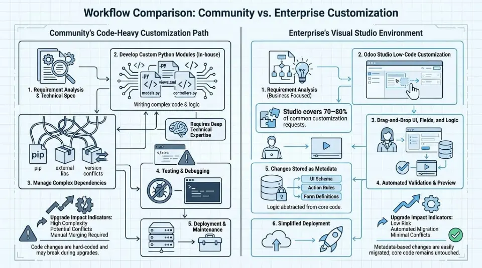 Enterprise upgrades automatically cover official modules. Custom code and extra modules still require testing and adjustment. Community users must manually coordinate upgrades across multiple third-party sources. This difference heavily impacts customization options, support needs, and upgrade stability.