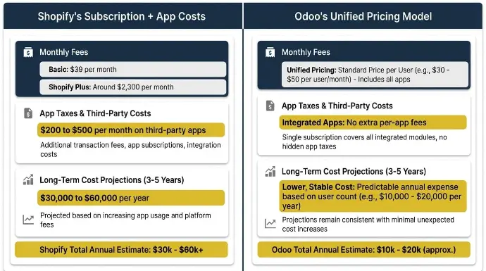 - Over a 3- to 5-year horizon, Odoo and Shopify cost structures diverge. Shopify’s transaction and app costs can compound, while Odoo offers a unified ERP approach that replaces multiple disconnected systems.