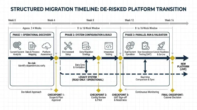 - Financial reconciliation is performed before cutover, ensuring ledger continuity