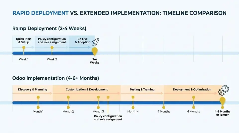 Ramp achieves a 2–4 week deployment velocity because it layers on top of existing ledgers, eliminating the need to re-engineer core Odoo inventory or procurement workflows.