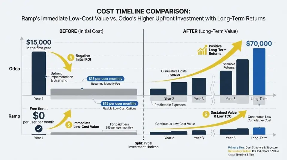 - Ramp typically costs $0 to low cost per user in year one, with a 503% 3-year ROI (Forrester TEI), while Odoo requires higher upfront implementation budgets but consolidates many operational tools into a single platform.