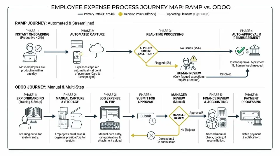 Ramp functions as the front-end spend platform where employees submit expenses, upload receipts, and complete approvals. Odoo remains the accounting system of record where journals, vendors, and financial reports live.
