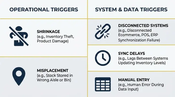 Operational triggers are the physical breakdowns that create discrepancies between what your warehouse holds and what your system believes.