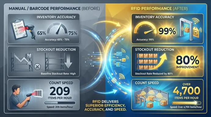 The University of Arkansas study at Bloomingdale’s showed RFID improving item-level accuracy by more than 27 percent, while a comparable non-RFID store saw accuracy decline by 4.24 percent. The difference was structural visibility.