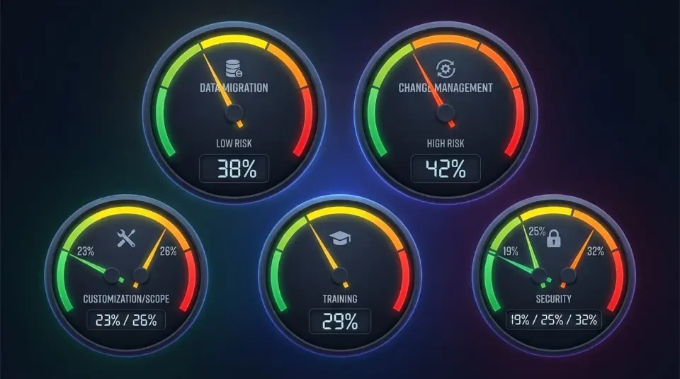 Over-customization accounts for 23% of failures, while scope creep accounts for 26%. Adding custom logic to preserve legacy habits often increases audit risk and future upgrade complexity.