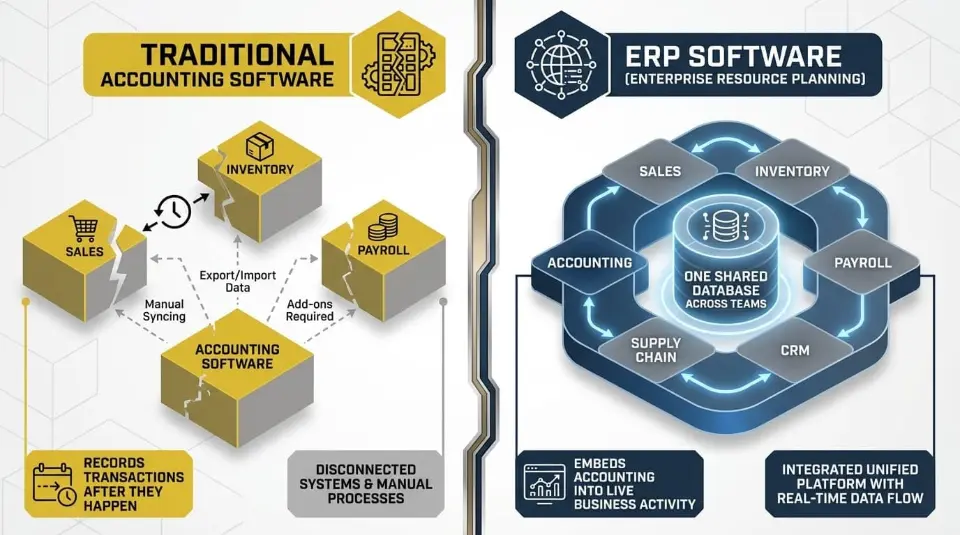 ERP software, by contrast, changes when accounting happens. In enterprise resource planning systems, accounting is triggered by the business itself. A sale, shipment, or inventory adjustment is immediately reflected in the ledger. Finance no longer chases numbers. It reviews them as they form.