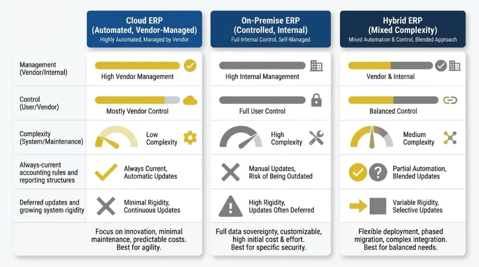 On-premises ERP gives the organization full control but shifts responsibility to internal teams. Accounting upgrades require scheduled downtime, testing cycles, and IT coordination. Over time, this often leads to deferred updates and growing system rigidity.