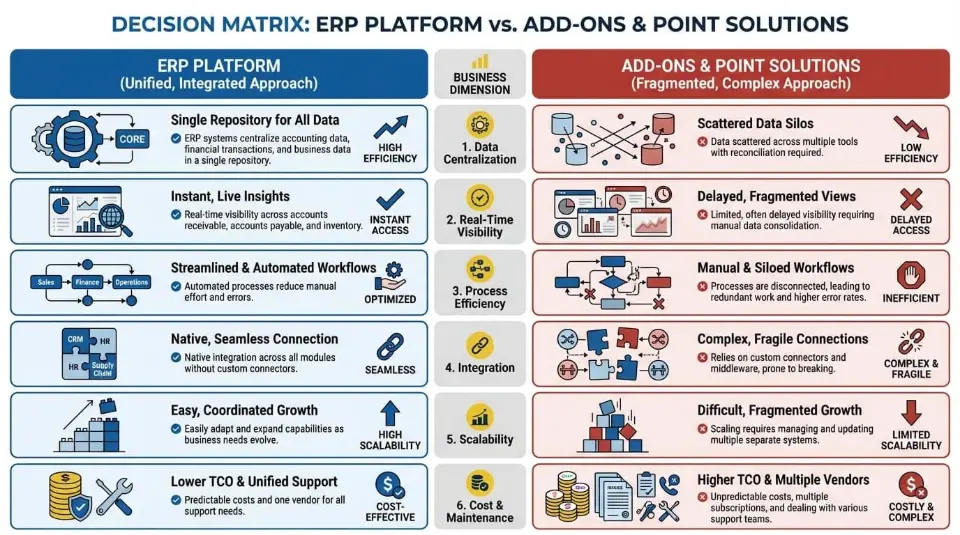 Before committing to ERP, many organizations consider extending their accounting system with add-ons and point solutions. On paper, this looks flexible. In practice, it introduces long-term risk that finance teams often absorb quietly.